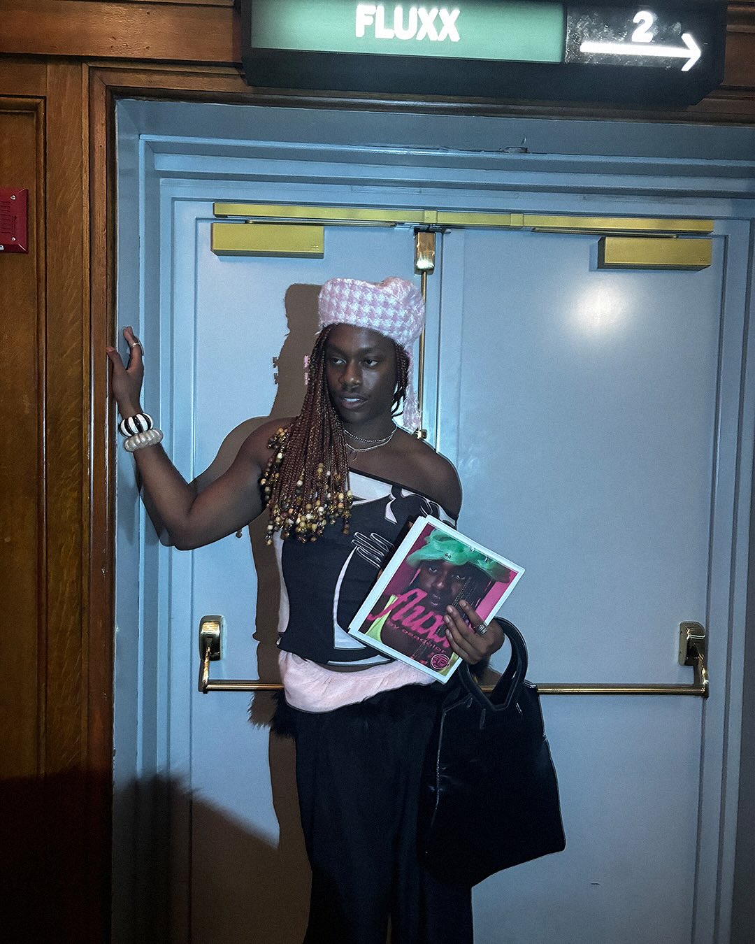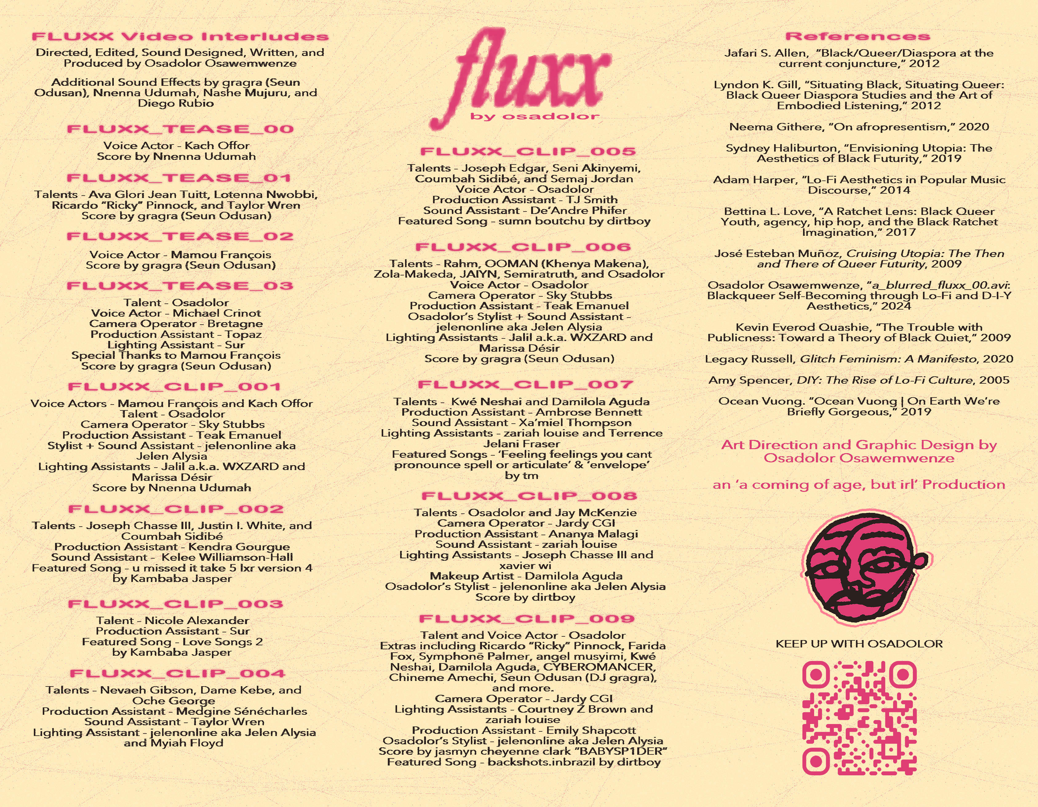 While conceptualizing FLUXX, I reflected on memories from my childhood, waking up early on a school day to catch MTV or VH1 music video shows on TV. Remembering these feelings of excitement, I approached FLUXX as if it were a pilot episode for a television program. The FLUXX video interludes zoom in and linger on a spectrum of social relations and communities in active formation, turning theoretical concepts into starting points for conversations and realizations. These interludes explore topics such as Afropresentism, glitch feminism, queer futurity, the Black ratchet imagination, and more, through scenes of everyday moments intertwined with surreal, fantastical, and at times comedic happenings, featuring many personable talents.